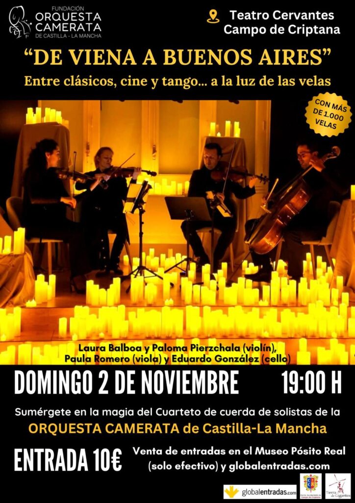 Una noche diferente, llena de emoción, historias y música para todos. Bajo la magia de más de mil velas, este concierto te lleva de la elegancia de Viena al ritmo apasionado de Buenos Aires, comparadas en el cine, el tango y los clásicos que han emocionado a generaciones. Además, los músicos irán explicando cada pieza con cercanía y humor, haciendo que la experiencia se amena, sorprendente y muy especial. Ideal para dejarse llevar, descubrir y disfrutar.