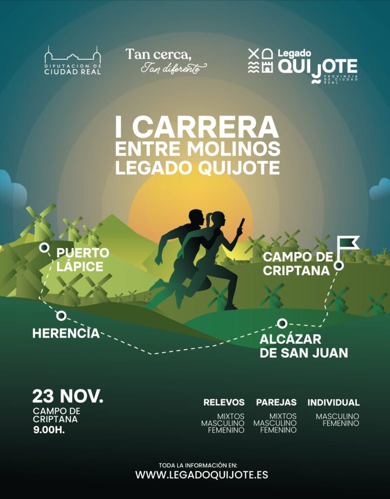 Prepárate para vivir una experiencia única donde la historia de Cervantes se mezcla con el deporte. La I Carrera entre molinos Legado Quijote te llevará entre los molinos más emblemáticos de La Mancha, como son los de Puerto Lapice, Herencia, Alcázar de San Juan y Campo de Criptana en un recorrido épico de 50km.